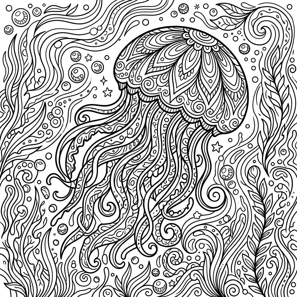 Immerse yourself in the enchanting world beneath the waves with this exquisite Flower Hat Jellyfish coloring page. The central figure, a magnificent jellyfish, boasts a bell adorned with mesmerizing, symmetrical patterns reminiscent of a blooming flower. Its numerous long, flowing tentacles are a cascade of intricate designs, ready for a vibrant splash of color. The surrounding aquatic environment is equally captivating, featuring swirling currents, delicate bubbles, and stylized underwater flora that create a rich and immersive backdrop, making every inch of the canvas a joy to explore.