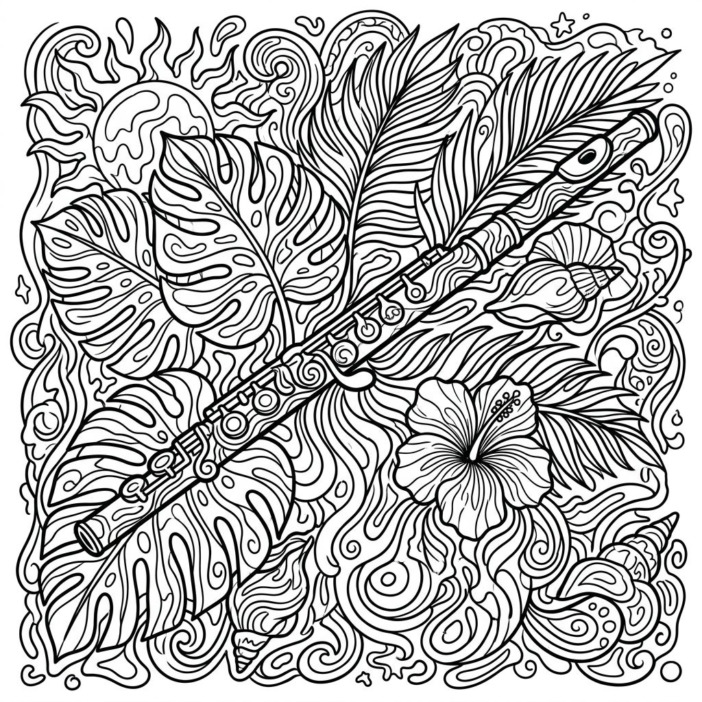 Let your creativity flow with this unique coloring page featuring a flute amidst a vibrant summer scene. Swirling psychedelic patterns, tropical leaves, and flowers await your colorful touch.