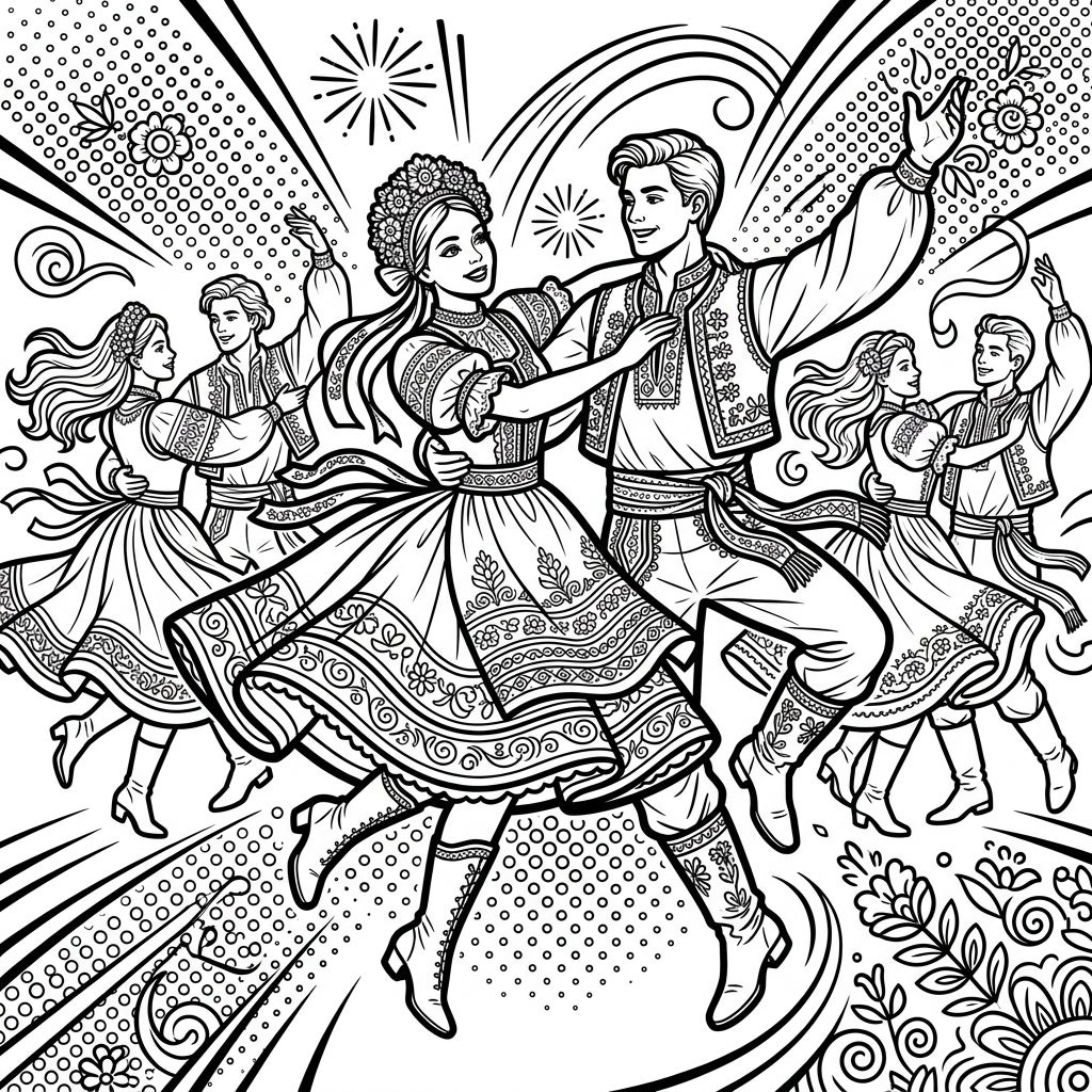 Step into a vibrant celebration of culture with this Folk Dance Pop Art coloring page! Our scene features several graceful dancers, with a central couple leading the lively performance. Their traditional costumes are richly detailed, from the ornate patterns on the woman's flowing skirt and elaborate headpiece to the man's intricately embroidered vest and sash. The dynamic poses convey movement and joy, inviting you to imagine the music and rhythm of the dance.