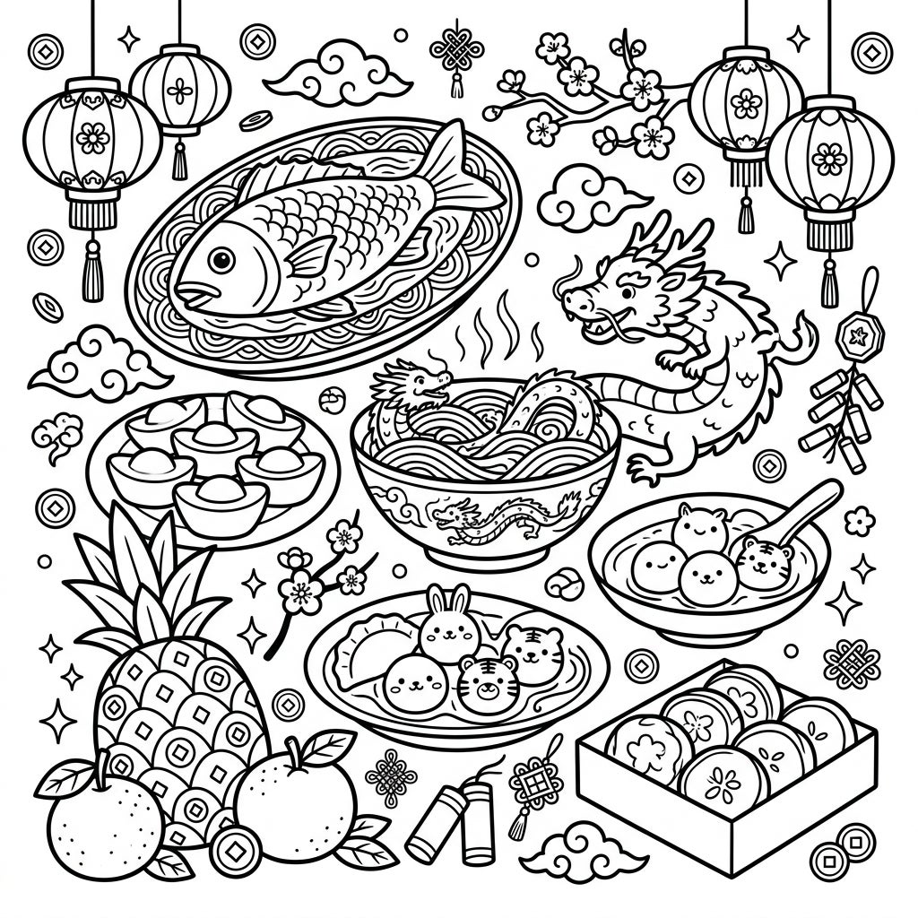 Get ready to celebrate the Lunar New Year with an abundance of delicious treats and festive decorations, all packed into one exciting coloring page! This intricate illustration features a spread of traditional holiday foods, including a whole steamed fish symbolizing prosperity, a hearty bowl of noodles for longevity, and golden ingots representing wealth. Adorable dumplings with smiling animal faces, a juicy pineapple, and bright tangerines add to the celebratory scene, inviting young artists to bring this feast to life.