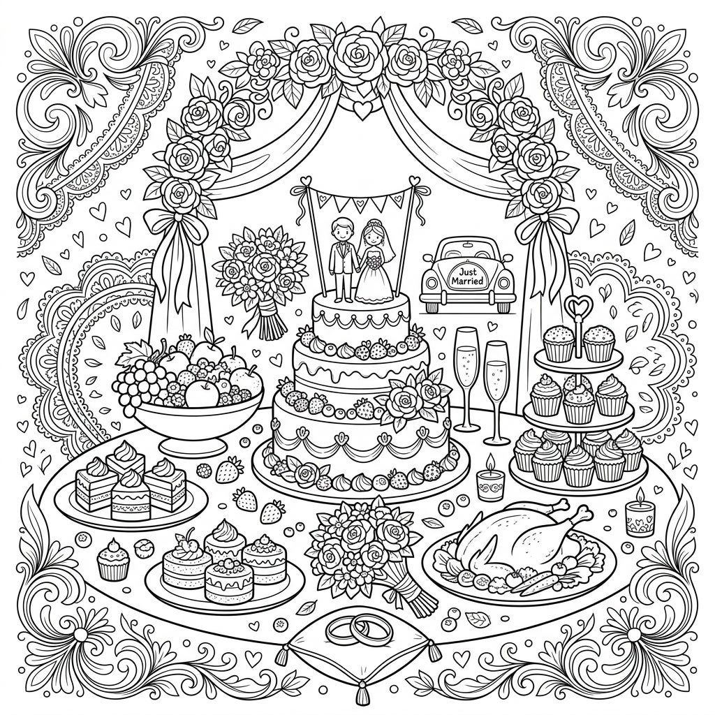 Immerse yourself in a beautiful wedding celebration with this detailed coloring page, showcasing a magnificent spread of delectable treats and romantic elements. Perfect for bringing festive cheer and intricate details to life with your favorite colors.