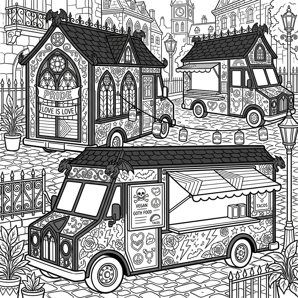 Roll into a uniquely creative coloring adventure featuring gothic food trucks celebrating Pride Month. This intricate design blends dark aesthetics with symbols of love and diversity for an engaging experience.