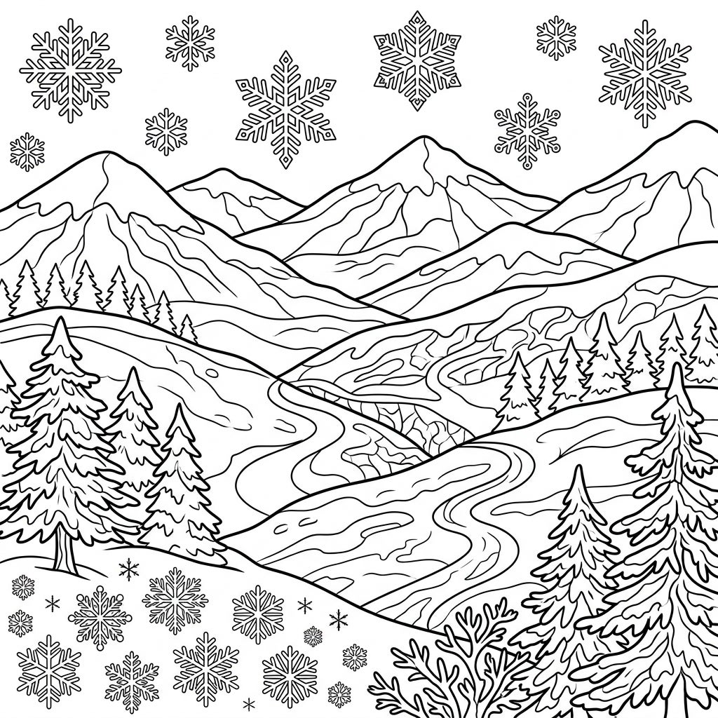 Immerse yourself in a beautiful winter landscape with this intricate coloring page. Featuring majestic foothills, towering evergreen trees, and a shower of delicate snowflakes, it’s perfect for a cozy creative escape.