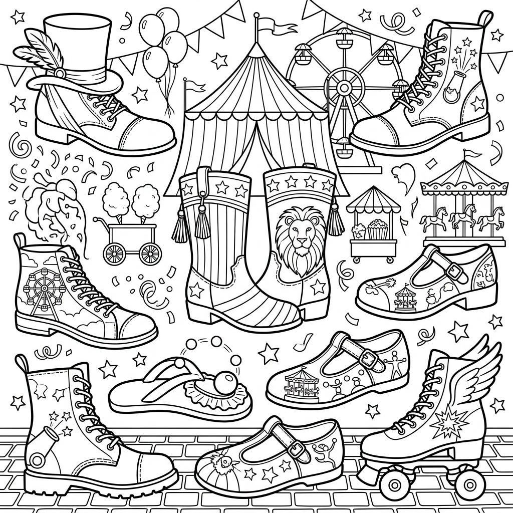 Dive into a spectacular world where fashion meets the big top! This engaging coloring page presents a delightful collection of footwear, each intricately designed with a carnival flair. Discover high-top boots featuring majestic lion faces and tassels, charming Mary Jane shoes adorned with merry-go-rounds, and even sneakers boasting detailed Ferris wheels. Look closely and you'll find shoes transforming into magician's hats with feathers, while roller skates sprout playful wings, all surrounded by a shower of confetti, balloons, and starry patterns.