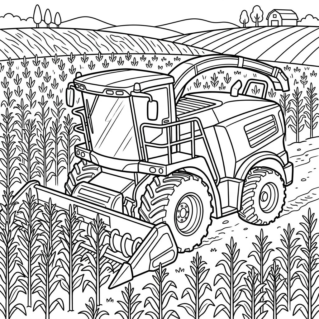 Unleash your creativity and make this farm scene uniquely yours! With its large, easy-to-fill sections, you have ample space to experiment with various coloring tools, whether you prefer crayons, colored pencils, or markers. Don't feel limited by traditional colors; perhaps your forage harvester is bright blue or a vibrant green! Consider using different shades to add depth to the cornfield or vibrant hues for the distant hills and farmhouse. This page encourages personal expression and offers a rewarding experience, allowing you to create a beautiful piece of art at your own pace.
