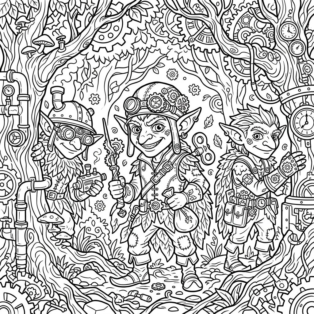 Journey into a captivating world where cunning forest goblins embrace the marvels of steampunk technology. This intricate coloring page invites you to bring to life a fantastical scene filled with gears, gadgets, and woodland charm.