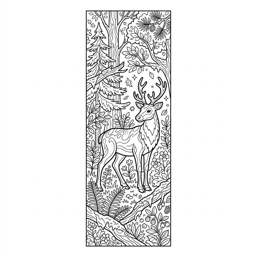 Step into a serene woodland with our exquisite Forest Reindeer Bookmark coloring page. This vertical design showcases a magnificent forest reindeer, distinguished by its elegant antlers and distinct body markings, standing gracefully amidst a rich tapestry of nature. The scene is brimming with intricate details, from towering pine trees and leafy deciduous branches to delicate ferns, blooming flowers, and scattered berries, providing a truly immersive coloring experience.