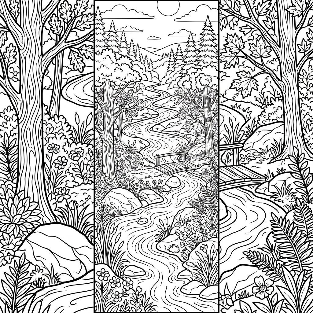 Immerse yourself in the tranquility of nature with this beautiful forest river bookmark coloring page. This intricate design, perfect for all ages, features a winding stream, lush trees, and a quaint bridge, ready for your creative touch.