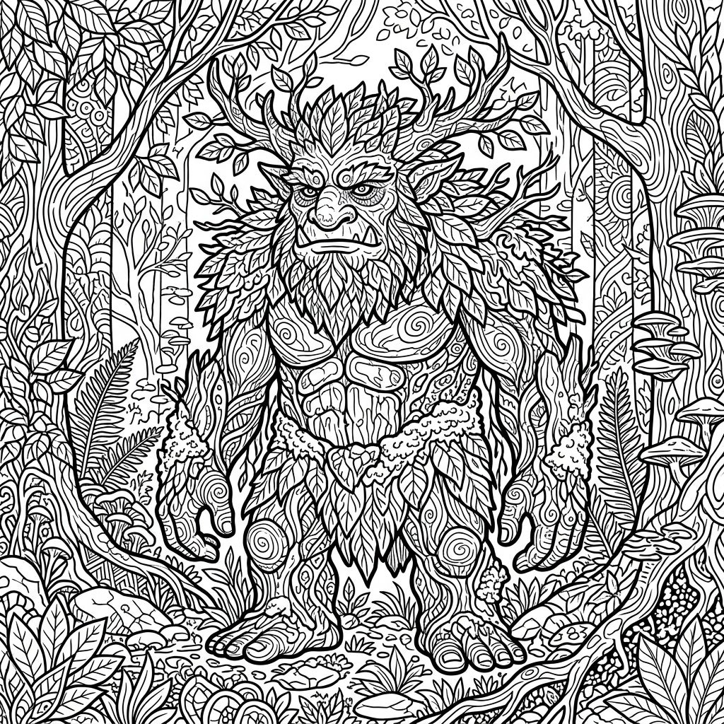 Step into a realm of intricate beauty with this stunning Zentangle coloring page, showcasing a majestic Forest Troll. Every detail of this woodland guardian, from its leafy crown and bark-like skin to the mossy textures adorning its powerful form, is meticulously crafted with a myriad of swirling lines and abstract patterns. The troll emerges from a vibrant forest backdrop, where ancient trees, delicate ferns, and mysterious mushrooms are all brought to life through complex Zentangle designs, inviting you to explore a world where fantasy and nature intertwine.