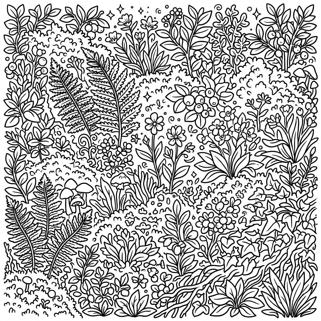 Explore the hidden world of the forest floor with this intricate coloring page, brimming with diverse plants, ferns, and berries. It's a perfect challenge for nature lovers and detailed-oriented colorists alike.