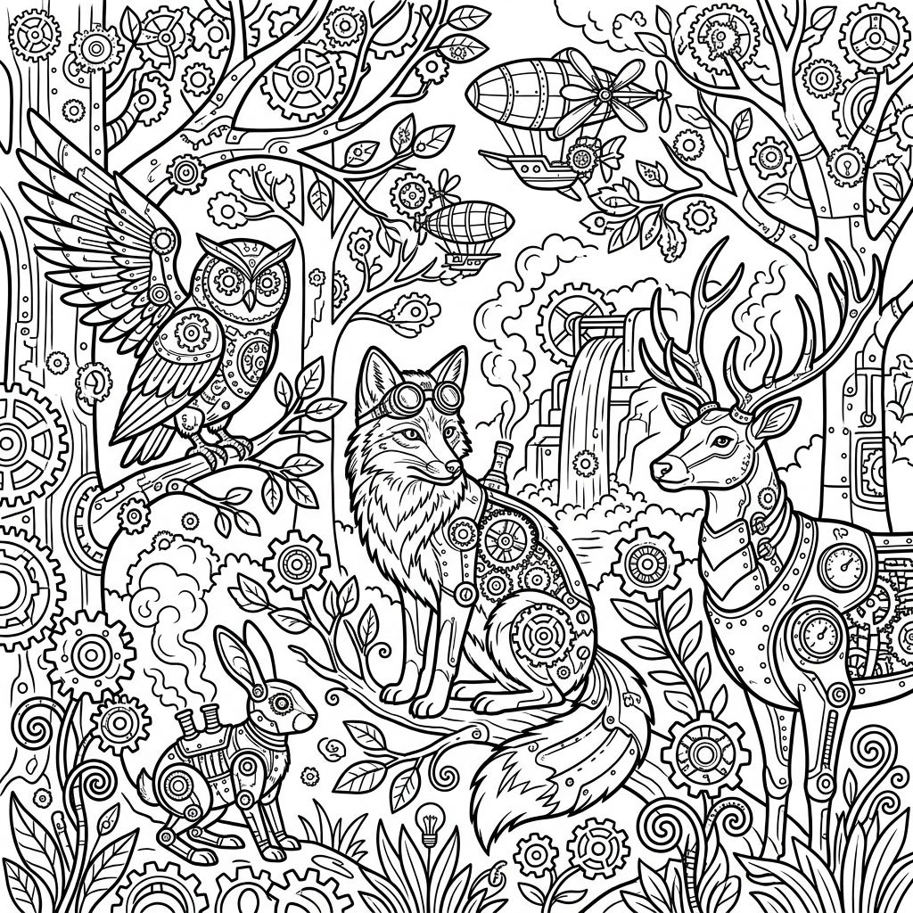 This scene is a celebration of imagination, blending the organic beauty of nature with the nostalgic futurism of the Victorian era. The industrial Victorian fantasy vibe invites you to explore a unique narrative where every gear and cog tells a story of innovation and adventure. It's an opportunity to escape into a world where familiar forest dwellers are transformed into magnificent, steam-powered beings, offering a delightful challenge for both seasoned colorists and imaginative newcomers.
