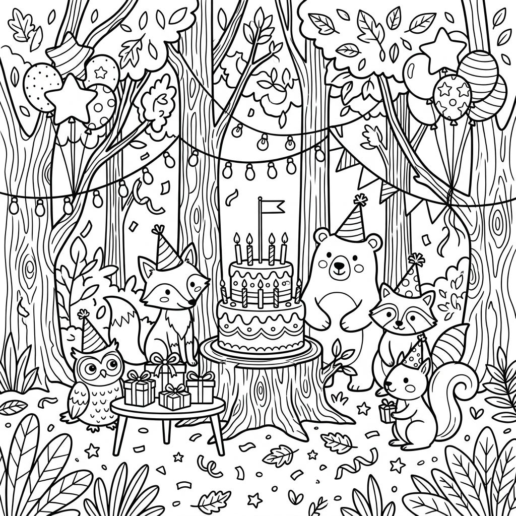 Step into a whimsical woodland scene where a charming birthday celebration is in full swing. This detailed coloring page showcases a variety of beloved forest creatures, including a clever fox, a cuddly bear, a playful raccoon, a wise owl, and an eager squirrel, all gathered around a magnificent two-tier birthday cake placed on a tree stump. The background is filled with dense trees and foliage, adorned with strings of twinkling lights and festive banners, setting a magical stage for the party.