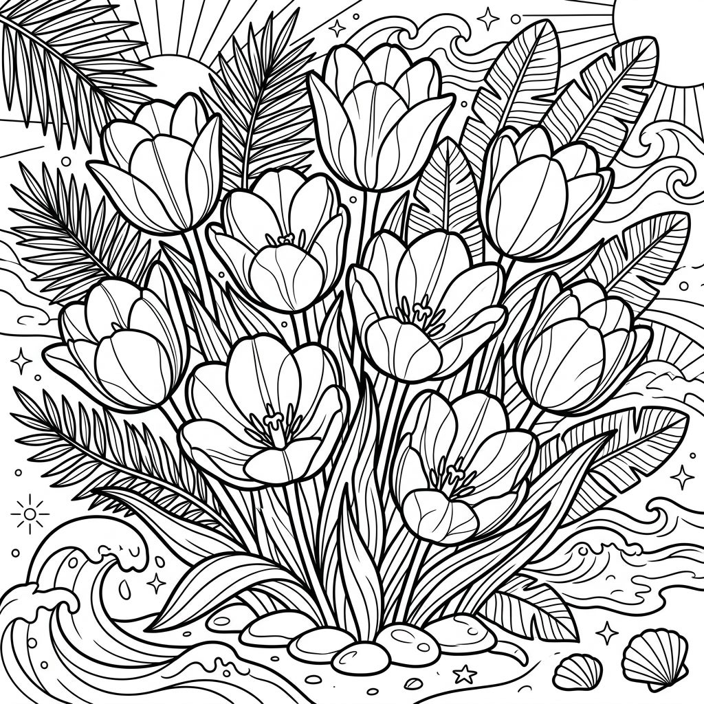 Celebrate the joy of summer with this beautiful coloring page featuring elegant Fosteriana tulips. Immerse yourself in a tropical scene complete with palm leaves, ocean waves, and sunny beach elements, perfect for a relaxing creative escape.