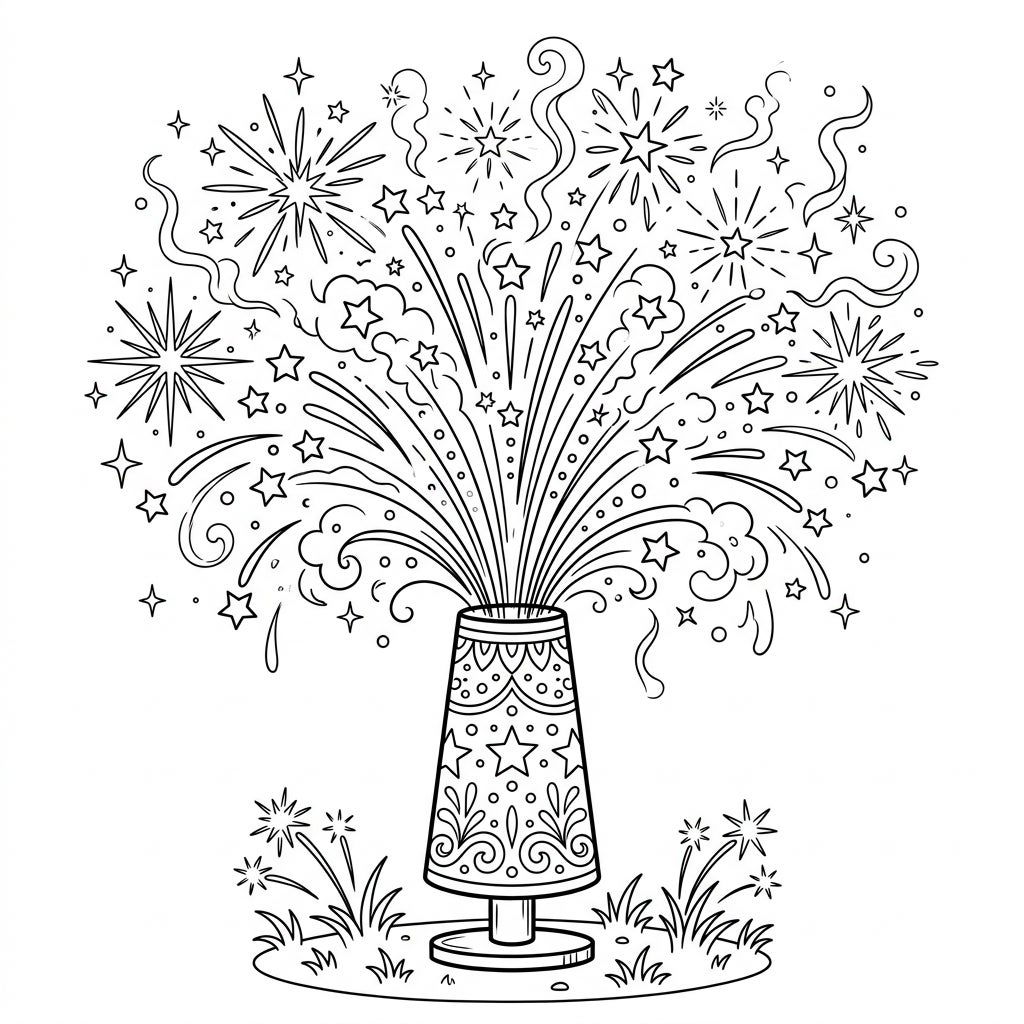 Dive into a captivating scene featuring a grand fountain firework, beautifully designed with intricate patterns on its conical base. From its peak, a spectacular eruption of various starbursts, swirling smoke, and delicate sparks shoots upwards, completely filling the page with dynamic energy. Around the base, smaller ground fireworks add to the display, creating a rich tapestry of celebratory visuals just waiting for your artistic touch.
