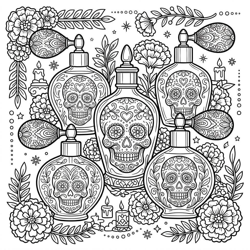 Unleash your creativity on the myriad of patterns, from the detailed floral designs on the marigolds to the swirling embellishments on each calavera. Experiment with bold, festive colors typical of Day of the Dead, or choose a more subdued palette to highlight the elegance of the perfume bottles. Consider using fine-tipped markers or colored pencils to bring out every exquisite detail and make this page a truly personalized masterpiece.