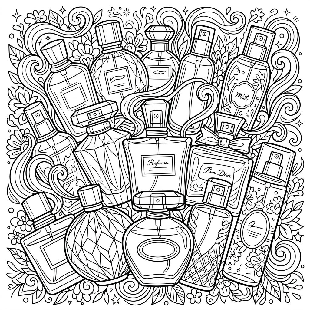 Dive into a world of sophisticated scents with this captivating coloring page featuring an array of beautifully designed fragrance bottles. Perfect for those who appreciate elegance and enjoy a detailed coloring experience.