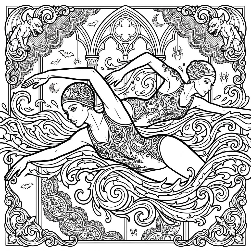 Explore a captivating coloring page featuring two graceful freestyle swimmers set against a stunning Gothic backdrop. Adorned with intricate lace, architectural details, and mystical elements, this design offers a unique artistic escape.