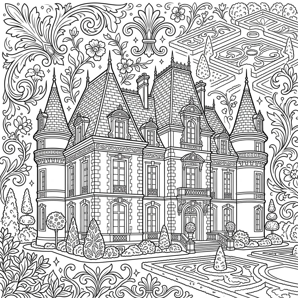 Discover the majestic beauty of a French Chateau mansion brought to life in this intricate coloring template. Every detail of this opulent residence is captured, from its stately facade adorned with ornate stonework to the elegant turrets rising gracefully and the characteristic steep hipped roofs punctuated by decorative dormer windows. Imagine the grand ballrooms and historic stories hidden within these walls as you prepare to add your unique palette.