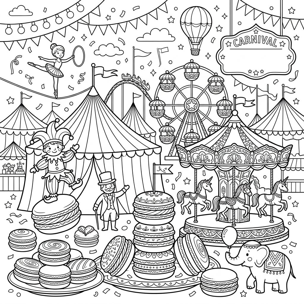 Welcome to a truly enchanting coloring experience, where the magic of the carnival meets the irresistible charm of French macarons! This intricate scene unfolds with colossal macarons forming whimsical platforms for cheerful characters like a jovial jester and a sophisticated ringmaster. Above, a graceful ballerina performs on a tightrope, adding to the spectacle. The background is bustling with iconic carnival elements: towering circus tents, a majestic Ferris wheel, a classic carousel adorned with unicorns, and even a hot air balloon drifting in the sky, all surrounded by festive banners and confetti. Tiny, delectable macarons are scattered throughout, waiting for your creative touch.