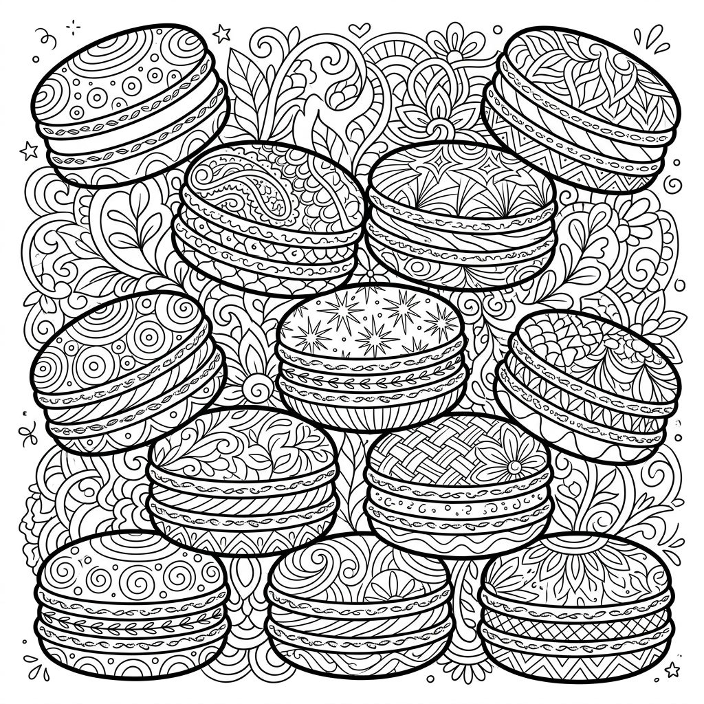 Immerse yourself in a delightful world of intricate patterns and delicious desserts with this Zentangle French Macarons coloring page. Each delicate cookie offers a unique artistic challenge, perfect for relaxing and unleashing your creativity.