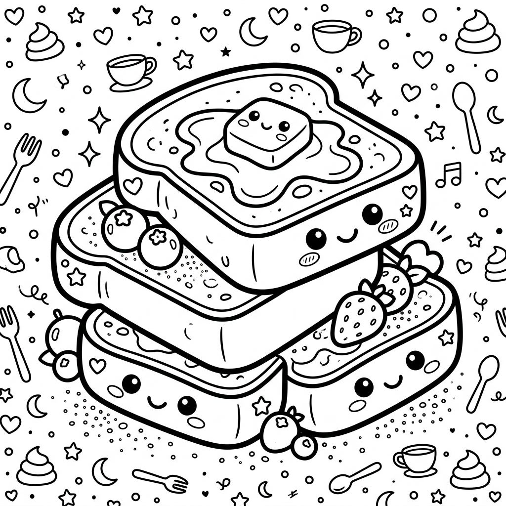 Indulge in a delightful coloring experience with our Kawaii French Toast design. Featuring a stack of smiling, adorable French toast slices, this page is packed with charming details and ready for your creative touch.