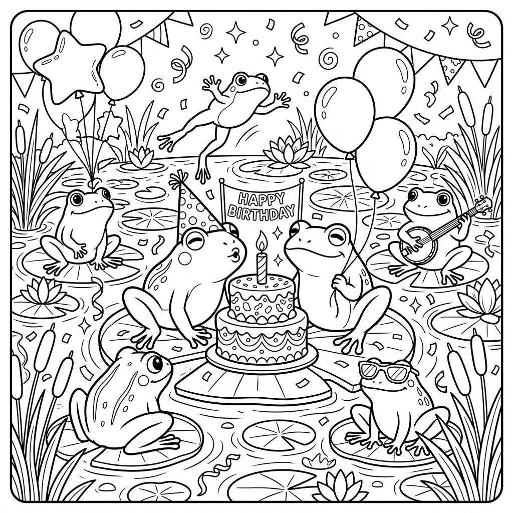 The air is thick with celebration as balloons float above, confetti rains down, and a cheerful 'Happy Birthday' banner proudly declares the special occasion. Every corner of this wetland wonderland buzzes with energy and happiness, inviting you to become a part of the festivities. Imagine the joyful croaks and laughter echoing across the pond as these charming creatures commemorate another year of fun and friendship. This page perfectly blends the natural beauty of a frog's habitat with the universal joy of a birthday bash.