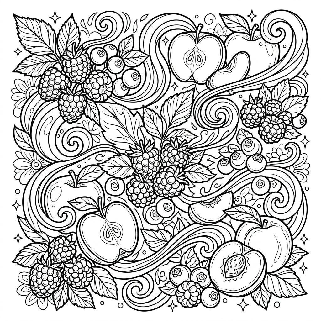 Immerse yourself in a delightful array of nature's candy with this intricate coloring page, perfect for teens. This design is overflowing with a vibrant mix of sweet and tangy fruits, including crisp apples, juicy peaches, plump raspberries, and succulent blueberries. Each fruit is beautifully rendered with detailed line work, nestled amongst elegant swirling patterns, delicate leaves, and subtle floral accents that evoke a sense of aromatic movement and natural beauty.