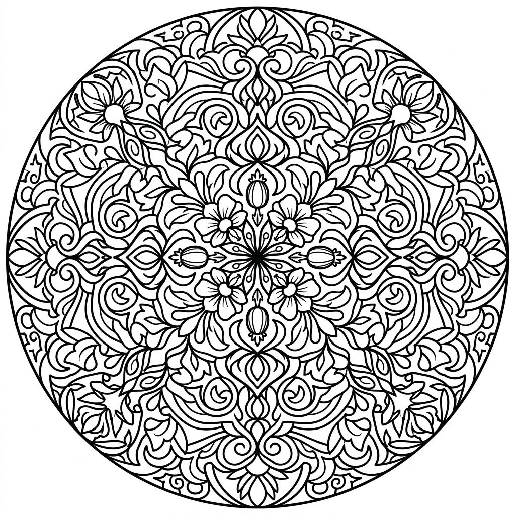Dive into the mesmerizing depths of this Full Moon Mandala coloring page, an exquisite fusion of celestial wonder and intricate artistry. This perfectly symmetrical design emanates from a central point, expanding outwards with a rich tapestry of interwoven floral motifs, delicate leaves, elegant swirls, and stylized petals. Every section is a miniature artwork in itself, providing a delightful challenge for your coloring journey without leaving any large empty spaces.