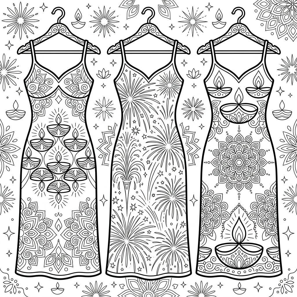 Dive into the joyous spirit of Diwali with this unique coloring page featuring three elegantly designed full slips. Each garment is adorned with intricate patterns inspired by the Festival of Lights, from dazzling fireworks to traditional diyas.