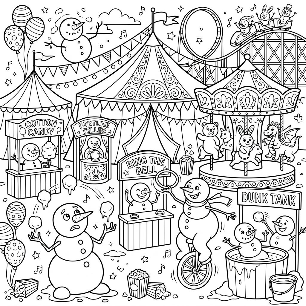 Dive into a whimsical world where funny snowmen bring the carnival to life! This delightful coloring page is packed with charming scenes of winter fun and festive fairground attractions, perfect for igniting your imagination.