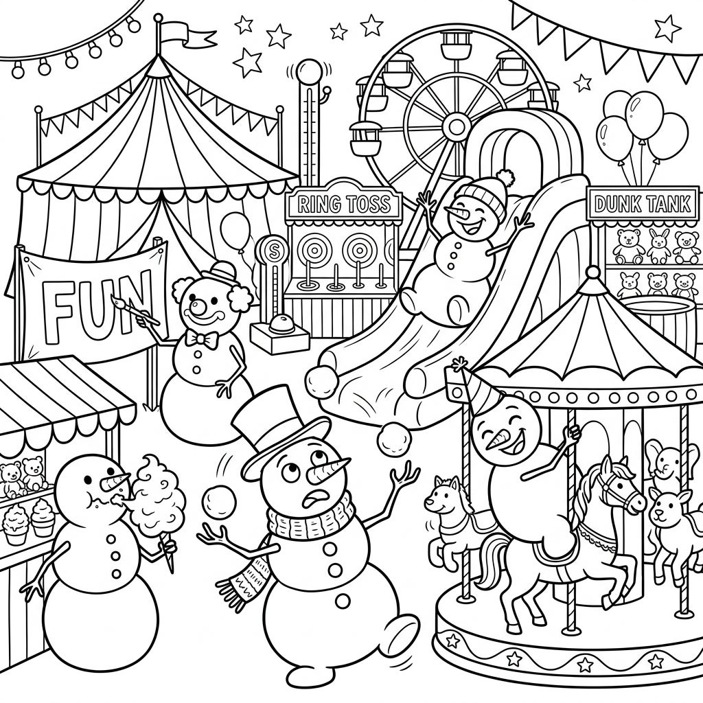 Immerse yourself in the joyful chaos of a winter carnival where humor takes center stage. This scene captures the vibrant spirit of a lively fair, complete with thrilling rides like the carousel, challenging games such as ring toss and a dunk tank, and plenty of sweet treats. The snowmen, with their comical expressions and active poses, perfectly embody the lighthearted and festive mood, promising hours of engaging entertainment as you bring their frosty frolics to life with your favorite colors.