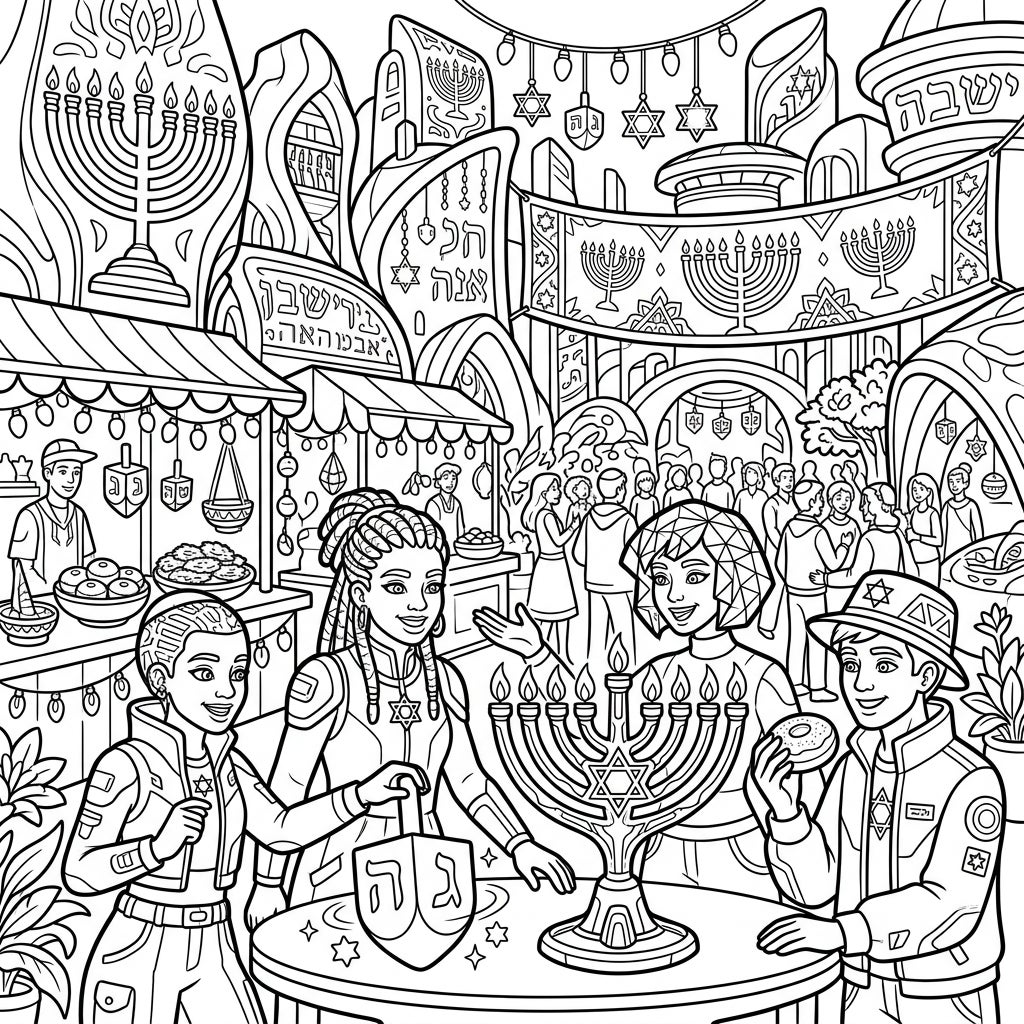 Step into a dazzling vision of Hanukkah past, present, and future with this captivating coloring page! Four adventurous future tourists are at the heart of a bustling Hanukkah celebration, gathered around a beautifully lit menorah on a table. One holds a traditional dreidel, another a delicious sufganiyah, all against the backdrop of a lively market filled with festive stalls, garlands of stars, and other joyous revelers. The intricate details of their futuristic attire and the classic Hanukkah symbols create a fascinating contrast.