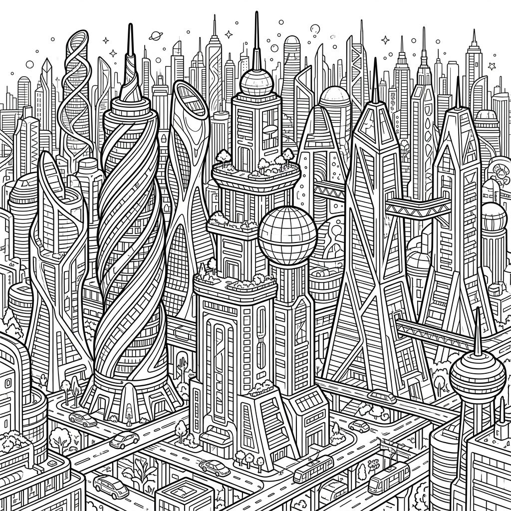 Step into a world where architecture knows no bounds with this incredible coloring page featuring a cityscape of futuristic skyscrapers. Every building is a marvel of design, showcasing advanced, innovative, and often unconventional shapes. From towering spirals that pierce the sky to geometrically complex structures with multiple tiers and unique facades, this page is packed with intricate details that will captivate your imagination and provide hours of engaging coloring.