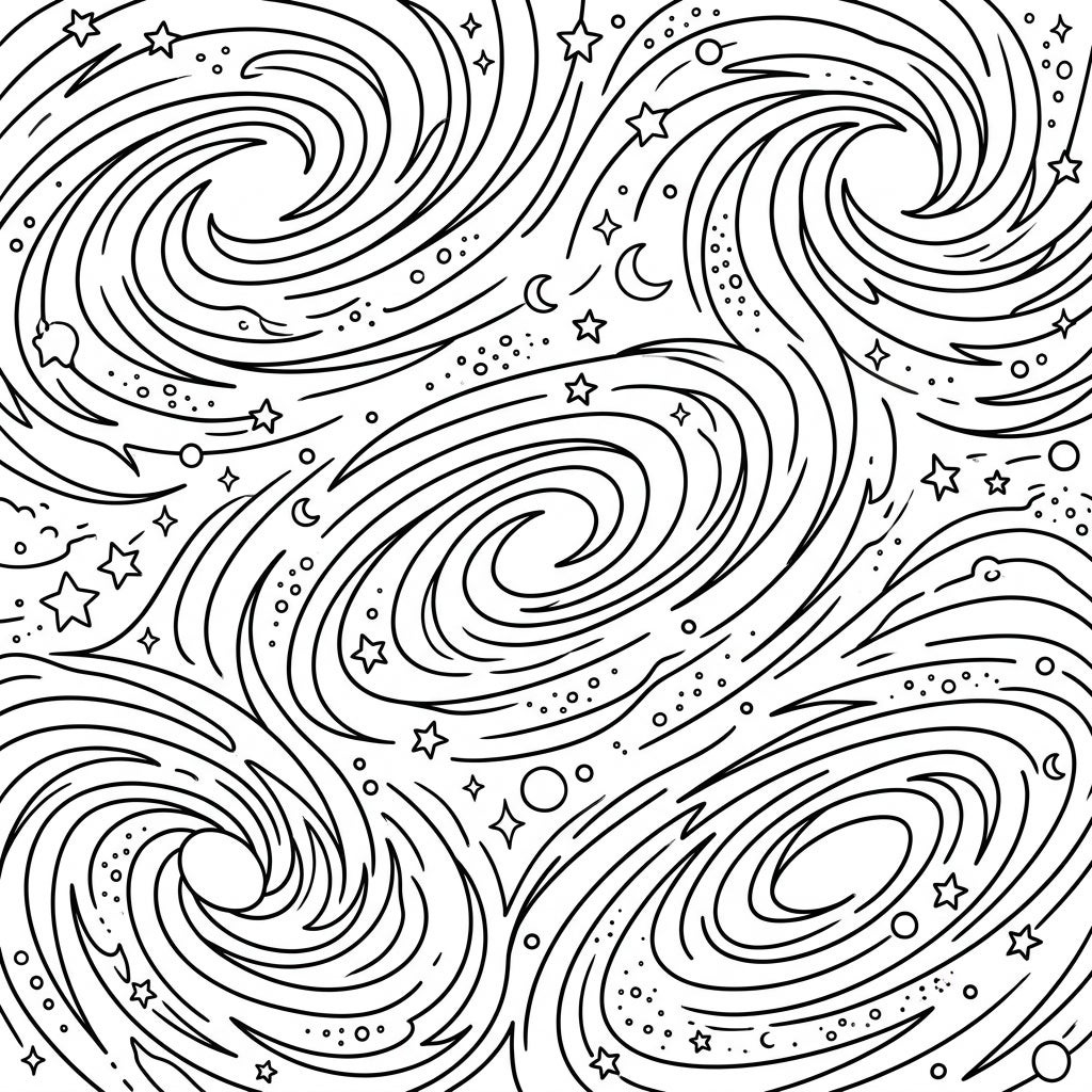 Encourage your child to experiment with a spectrum of colors when tackling these cosmic swirls. They can use deep blues and purples for the galaxy bodies, bright yellows and whites for stars, or even go wild with unexpected hues to create their own unique nebula. Coloring these intricate yet accessible patterns helps develop fine motor skills, hand-eye coordination, and ignites creative expression, offering hours of engaging and educational fun.
