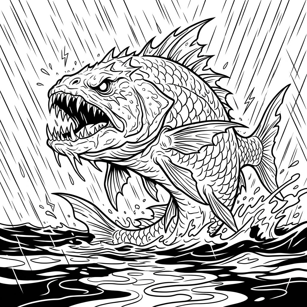Unleash your inner artist with this thrilling coloring page featuring a gargantuan fish battling a stormy rainy day. Perfect for those who love powerful creatures and dramatic weather scenes, this design offers an exciting challenge.