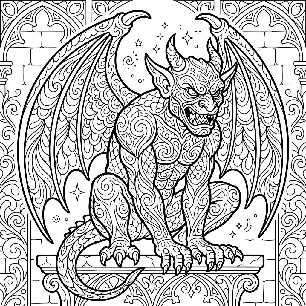 Discover an awe-inspiring gargoyle coloring template, meticulously designed to challenge and delight. This powerful stone guardian is depicted with a formidable, horned head and a snarling expression, ready to ward off evil. Every inch of its muscular body and expansive, leathery wings is adorned with intricate swirling patterns and scale-like textures, inviting a symphony of colors and shading techniques to bring it to life. Its sharp claws and imposing figure rest upon an ornate stone pedestal, creating a dramatic focal point for your artistic expression.