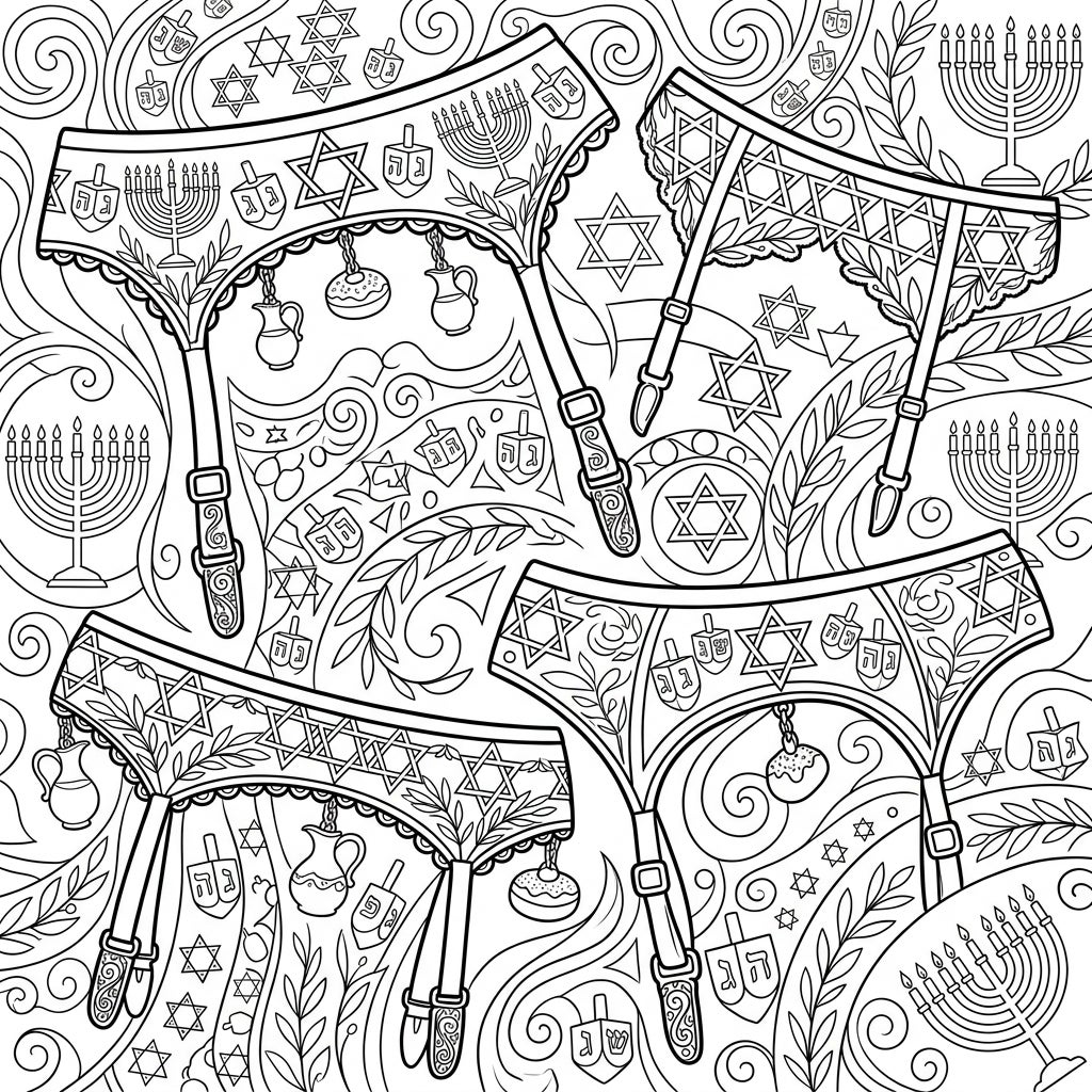 Celebrate the Festival of Lights in an unexpectedly stylish way! This coloring page offers a sophisticated nod to Hanukkah, blending the festive spirit of the holiday with intricate, adult-friendly designs. It's a wonderful opportunity to reflect on the traditions and symbols of Hanukkah, bringing them to life with your personal artistic flair. Whether you're looking for a relaxing activity during the holiday season or a unique way to express your appreciation for cultural motifs, this fusion of garter belts and Hanukkah imagery creates a truly special and engaging coloring adventure.