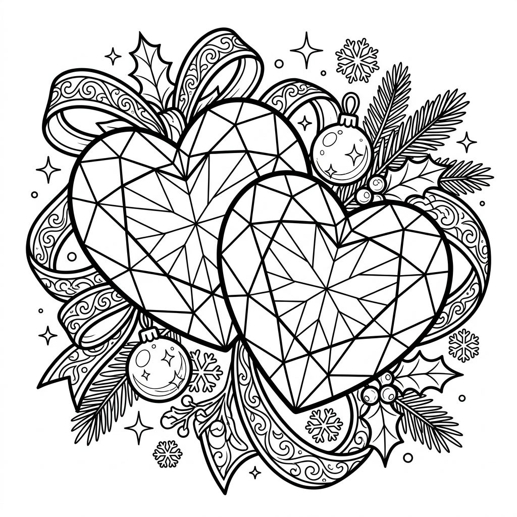 This exquisite coloring page presents a captivating tableau of two intricately faceted hearts, designed to resemble sparkling gemstones. Each heart is rendered with precise geometric lines, inviting you to imagine the dazzling facets of a precious jewel. Surrounding these radiant centers is a rich tapestry of classic Christmas motifs: elegant swirling ribbons, delicate holly leaves with berries, lush pine branches, and shimmering baubles, all ready to burst with color.