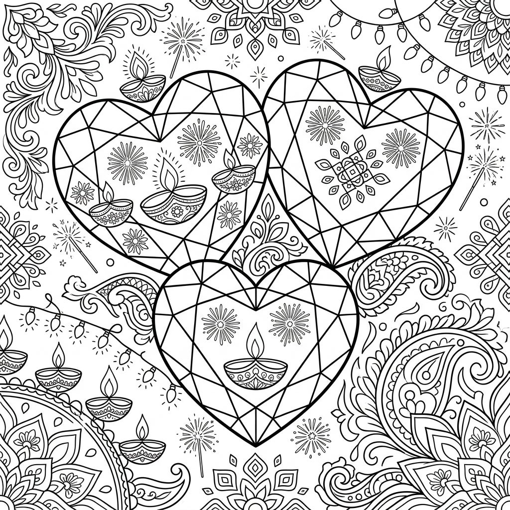 Immerse yourself in the festive spirit of Diwali with this stunning coloring page featuring intricately designed gemstone hearts. Adorned with traditional diyas, radiant rangoli patterns, and celebratory fireworks, it offers a beautiful blend of sparkle and tradition.