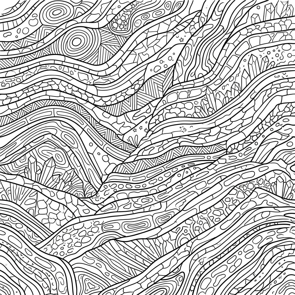 Unearth a world of natural wonder with this exquisite geological strata patterns coloring page. The design features a dynamic composition of wavy, organic lines that mimic the layered formations found deep within the Earth. Interspersed among these flowing strata are intriguing elements like crystalline structures, resembling clusters of quartz or amethyst, alongside areas detailed with pebble-like textures, intricate geometric patterns, and swirling ancient motifs. This rich tapestry of visual details ensures a truly immersive and continuously engaging coloring experience, inviting you to explore every curve and crevice.
