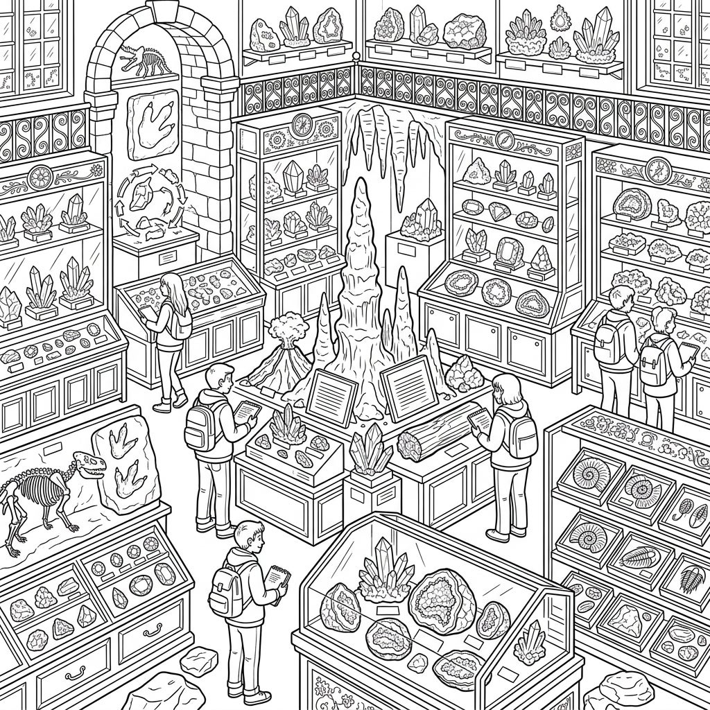 Step into an incredible geology and mineral museum, brimming with fascinating exhibits waiting for your creative touch. Discover stunning crystals, ancient fossils, and magnificent rock formations as you bring this detailed scene to life with color.