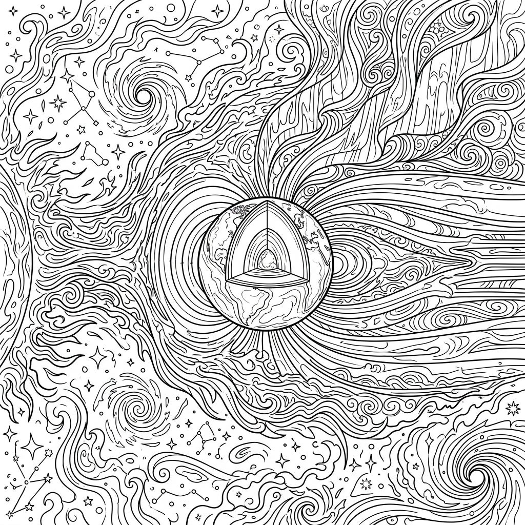 This detailed coloring page invites you to visualize the awe-inspiring phenomenon of a geomagnetic storm. At its heart lies a beautifully rendered cutaway of Earth, revealing its core and layers, symbolizing our planet's vital magnetic shield. Surrounding our world, a dynamic network of intricate swirling lines, energetic currents, distant stars, and delicate constellations depict the powerful solar winds interacting with Earth's magnetosphere, creating a truly cosmic spectacle.