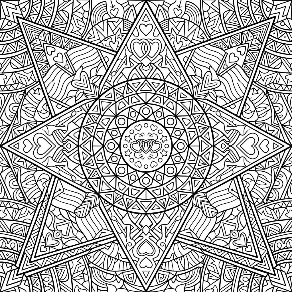Discover the captivating beauty of this Geometric Mandala, a coloring page crafted with precision and passion. This intricate design features a stunning array of geometric shapes, including sharp triangles, perfect circles, and elegant squares, all woven into a radially symmetrical pattern. Look closely to find delicate interlocking hearts and subtle star patterns integrated within the complex structure, inviting a deep dive into detailed coloring.
