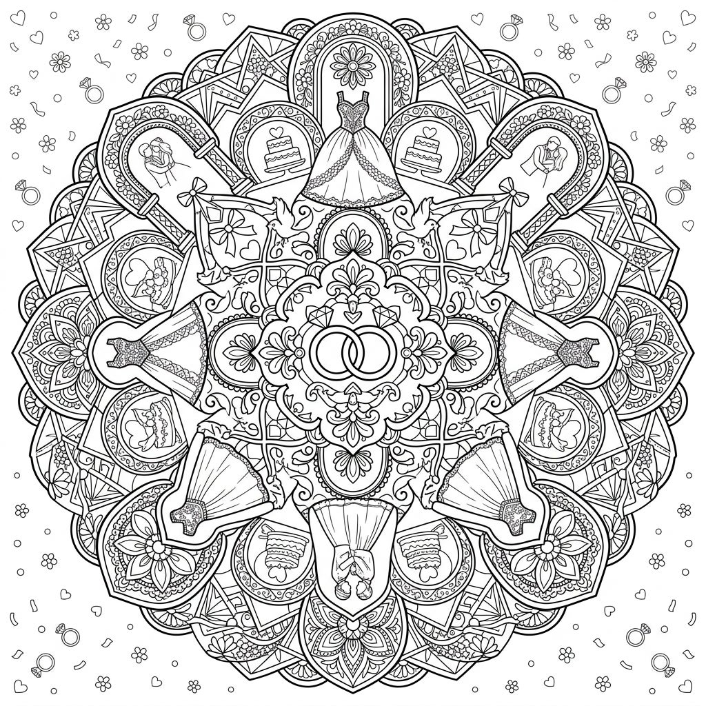 Immerse yourself in the beauty of love with this exquisite geometric mandala coloring page, intricately designed with romantic wedding motifs. From elegant dresses to delicate rings, it offers a relaxing and joyful coloring experience for adults and teens.