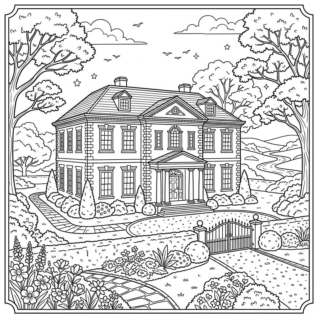 Unveil the grandeur of a magnificent Georgian mansion through this intricate coloring template. The stately home dominates the scene with its perfectly symmetrical facade, imposing classical columns framing the entrance, and elegant pediments. Every detail, from the ornate windows to the textured brickwork, is meticulously rendered, inviting you to explore the architectural beauty of this historical period. Surrounding the mansion, a beautifully manicured garden unfolds, complete with lush bushes, mature trees, and a charming winding pathway leading to a decorative wrought-iron gate.