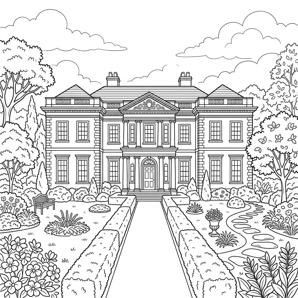 Step into a world of classical elegance with this beautiful Georgian mansion coloring page. Featuring symmetrical architecture and a lush garden, it promises a relaxing and detailed coloring experience.