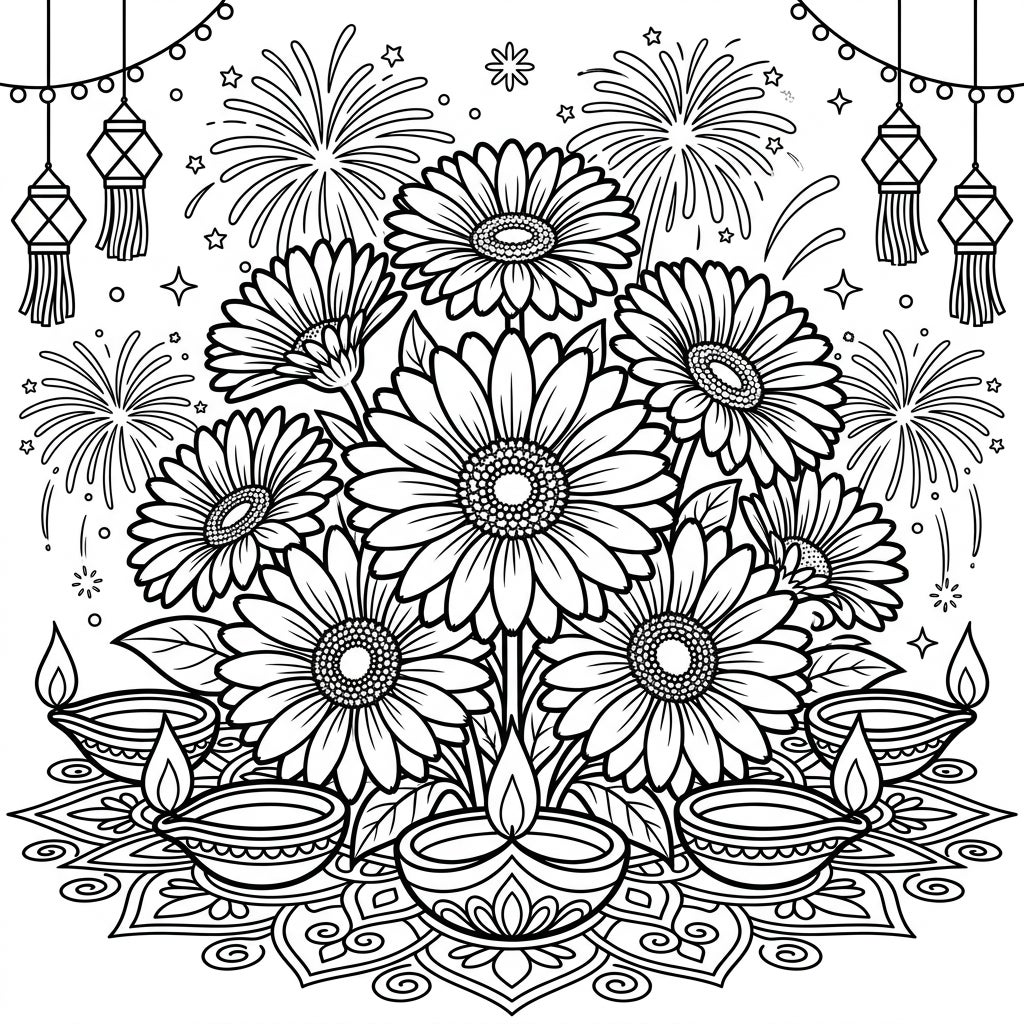 Immerse yourself in the joy of Diwali with this vibrant coloring page featuring a bountiful bouquet of Gerbera daisies. Adorned with traditional diyas, intricate rangoli, and celebratory fireworks, it offers a delightful blend of floral beauty and festive cheer.