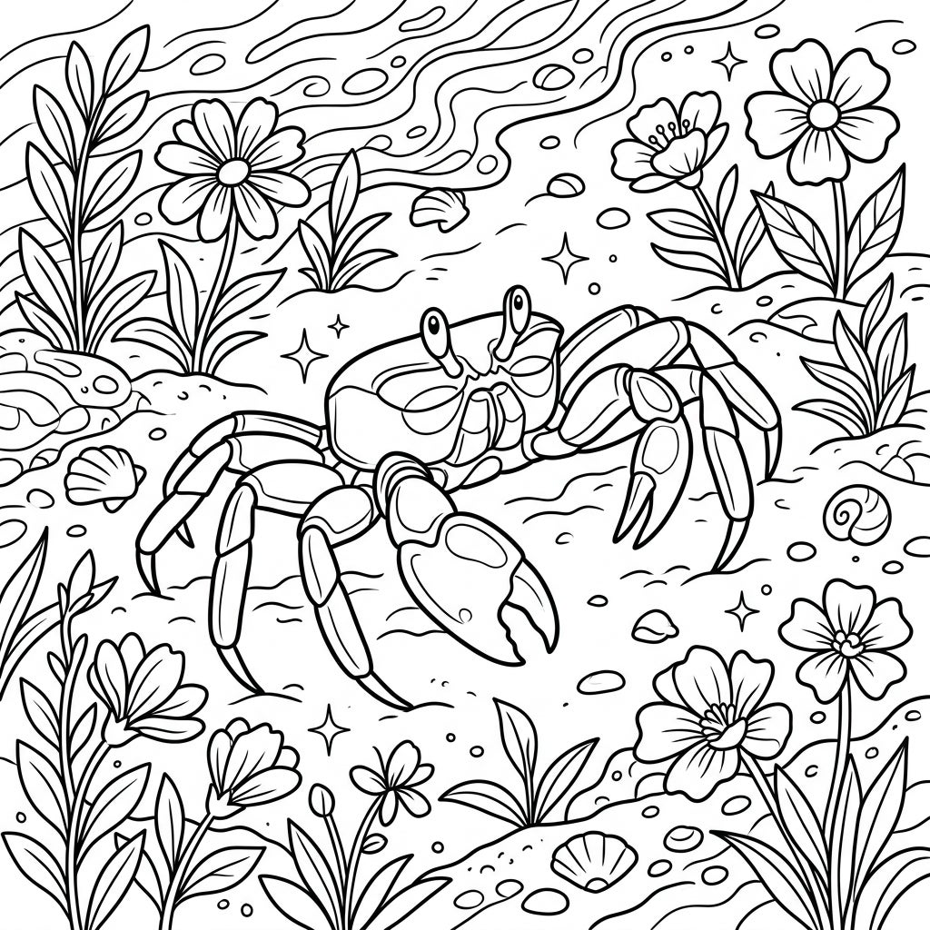 This enchanting coloring page captures a lively scene on a spring sandy beach, where a quick-moving ghost crab takes center stage. Its distinctive segmented body, keen eyes, and powerful claws are ready to be brought to life with your favorite colors. The crab is depicted amidst a rich tapestry of natural elements, including various blooming flowers with detailed petals and leaves, scattered seashells of different shapes, and small pebbles, all rendered in crisp, clean lines perfect for coloring enthusiasts.