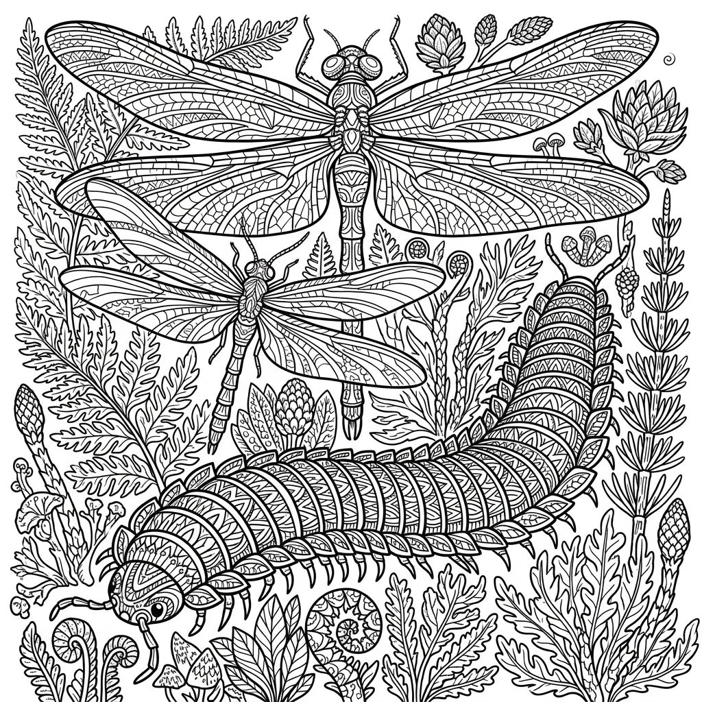 Embark on an epic coloring journey back to a time when colossal creatures roamed the Earth. This highly detailed adult coloring page presents a mesmerizing tableau of giant prehistoric insects. Dominating the scene are two magnificent dragonflies, their intricate wings adorned with delicate patterns, alongside a colossal millipede-like creature whose segmented body is a canvas of complex textures, all nestled within a dense forest of ancient ferns and primeval plant life.