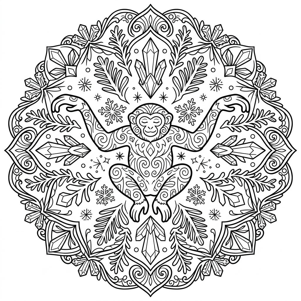 Unleash your creativity on this detailed mandala. Consider using cool blues, purples, and silvers to emphasize the icy theme, or warm tones to create a contrasting, cozy feel for the gibbon. Experiment with different shading techniques on the ice crystals and the gibbon's fur to add depth and realism, making each element truly sparkle. This page offers ample opportunity for both precise detailing and broader color application, promising a deeply satisfying and personalized artistic journey.